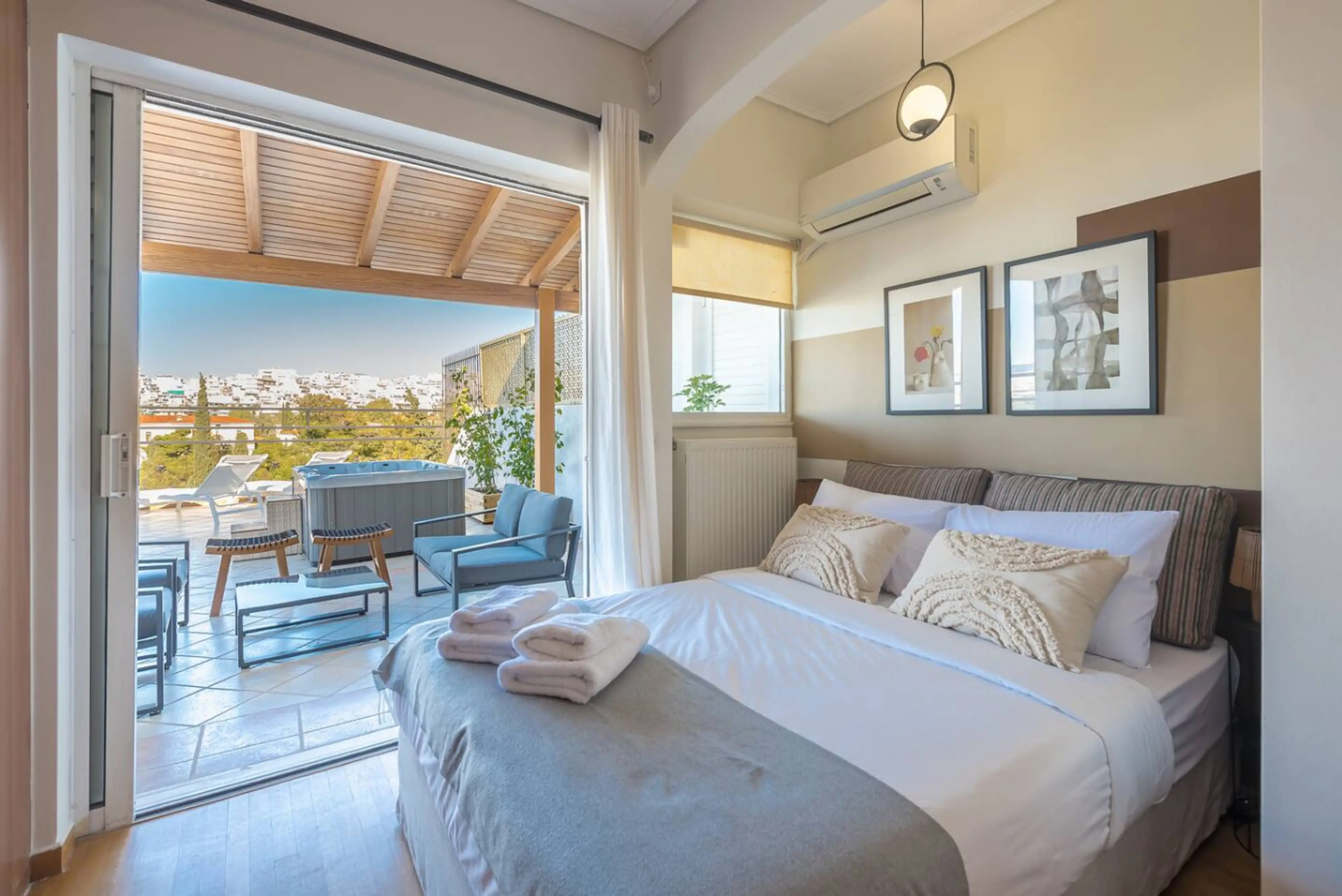 Wake up above Athens.This two-level penthouse in Gkizi is a rare blend of privacy, design, and panoramic views—made for travelers who want more than just a place to sleep. From golden sunsets over Evelpidon Park to nights under the stars in your private rooftop jacuzzi, this home offers a refined At...